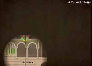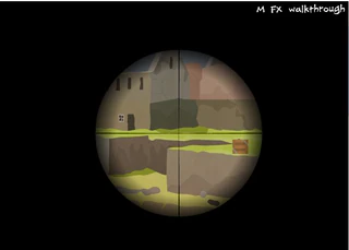 2. 1. Ходит по крыше справа. 2. Выглядывает в двери на втором этаже в центре. 3. За ящиком на втором этаже, стрельнуть справа по кустику под указателем, знак упадет и придавит его. 4. Пальнуть слева по дереву, он выползет из двери. 5. Стрельнуть по камешку на крыше нижнего уровня в центре, камешек покатится в дырку и вытолкнет ниже трупик.
