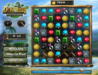 Игра Dukateers относится к серии логических игр "собери 3 в ряд" Нужно собрать ряд из трёх и больше кристаллов и тогда они пропадут. Здесь ваша задача усложняется тем что игра идёт на время и прибавить времени можно только срезая много рядов. Если вы видите что какой-то кристалл мигает, нужно немедленно его уничтожить - через 30 секунд он превратится в камень, который можно будет только разбить или взорвать. В игре есть такие бонусы как пистолет, бомба и кирка. Бомбы и кирки появляются тогда когда они опускаются в самый низ игрового поля, пистолеты изредка появляются сами на поле. Двойное нажатие на пистолет активирует бонус - он убирает весь ряд по горизонтали или вертикали, даже камни. Уровень пройден тогда когда корабль на шкале внизу экрана дойдёт из левого угла в правый, после этого даётся бонусный уровень в котором за наикратчайшее время на доске нужно отметить все одинаковые кристаллы.