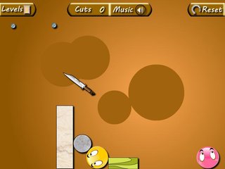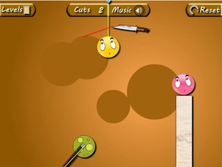 Поработаем в роли Купидона в новой Cupid's Blade. Только вместо лука со стрелами в нашем распоряжении будет ножик, с помощью которого мы будем резать все, что мешает двум шарикам быть вместе. Да, вам нужно сделать так, чтобы желтый и розовый шарик были вместе. За дело!